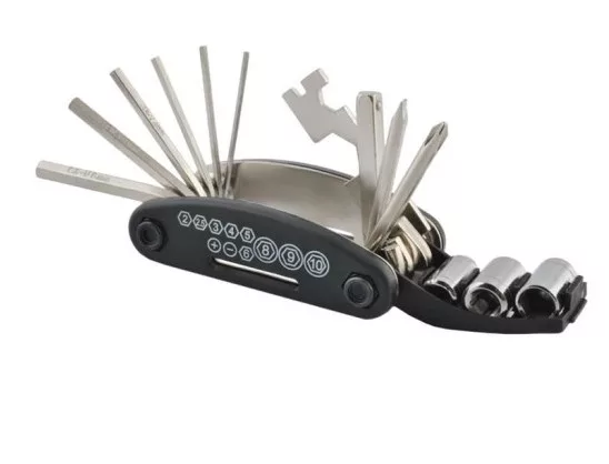 16 az 1-ben kerékpárkulcs készlet. A 16in1 kerékpárkulcsok kompakt szettje minden kerékpáros számára tökéletes eszköz. Az egészet bicska formájában zárták le. Kicsi mérete miatt mindig magával tudja vinni a kerékpáros táskában, hátizsákban vagy zsebben. A készlet tartalmazza a kerékpár gyors és független javításához szükséges eszközöket. Ezzel a készlettel nyugodtan indulhat hosszú útra. A készlet a következő eszközöket tartalmazza: 2, 2,5, 3, 4, 5,6 adapter adapterekhez, sapkák: 8mm, 9mm, 10mm, lapos kulcs: 8mm, 10mm, 15mm, küllőkulcs 14GE, lapos csavarhúzó, phillips csavarhúzó.