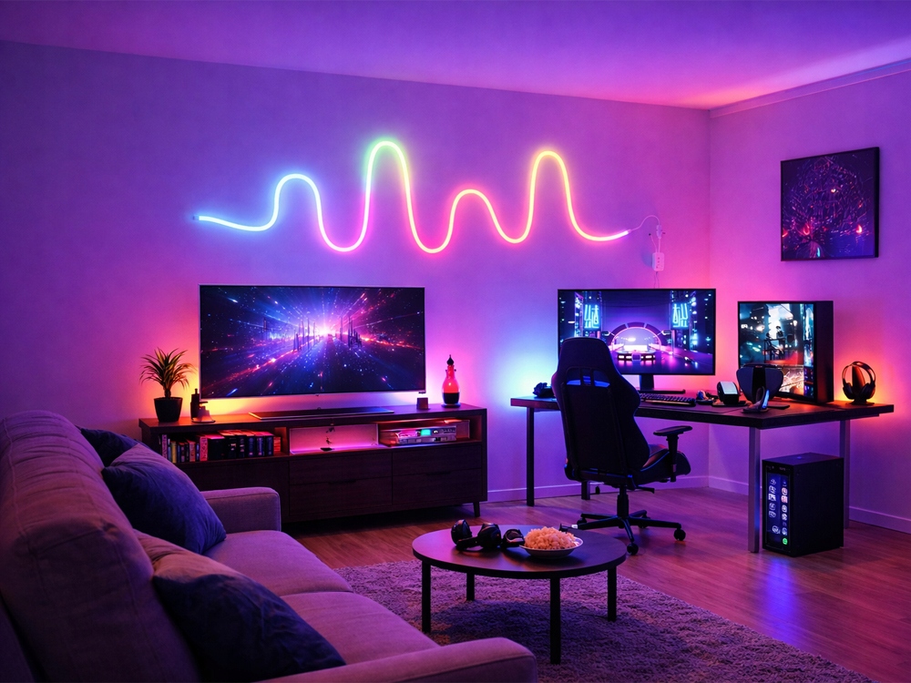 Egy modern, neon stílusú LED szalag , amely teljesen átalakítja otthonod hangulatát. Az intenzív színek, a lágy színátmenetek és az egyenletes fénycsík hatása egyedi jelleget kölcsönöz a helyiségnek.