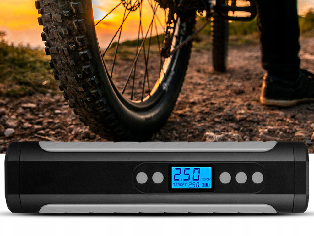 - Az autó- és kerékpárkerekekhez való pumpa minden helyzetben kényelmet és gyorsaságot biztosít Önnek. Függetlenül attól, hogy kerékpár- vagy autógumiról van szó, szivattyúnk fenntartja a megfelelő nyomást, így biztosítva a biztonságos utazást. A „+” és „-” gombokkal állítsa be a megfelelő nyomást. A kompresszor automatikusan leáll, miután elérte a beállított nyomást.