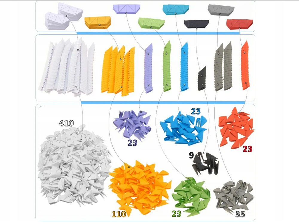 A készlet tartalmazza: - Papírelemek - 656 PCS.- Kézi - 1 PC.