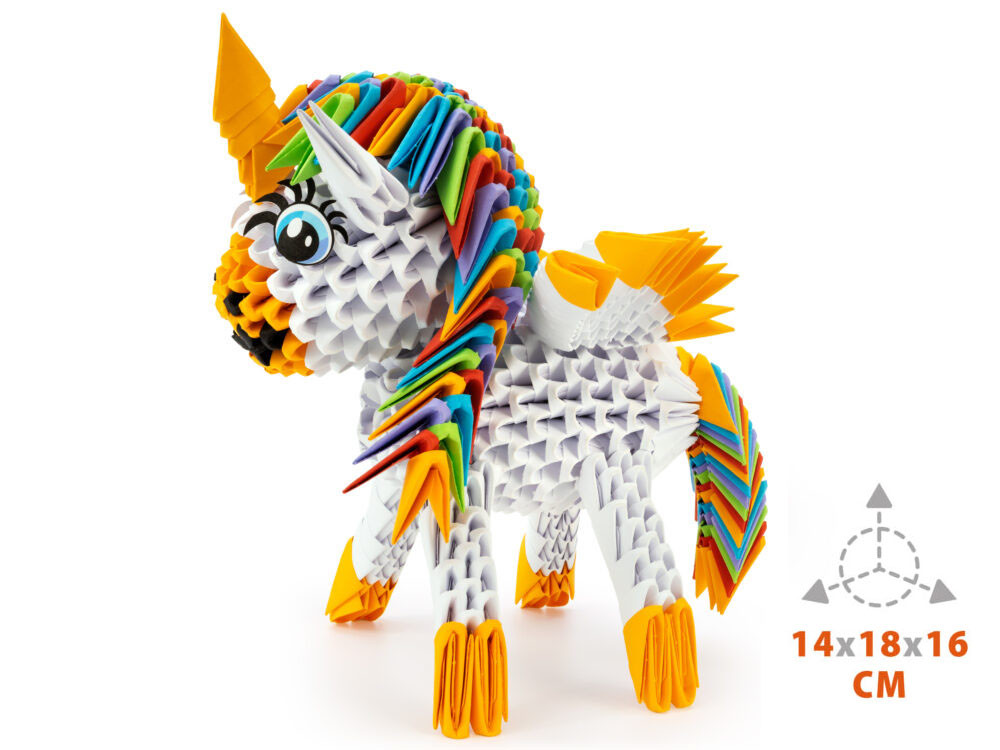 Origami 3D - Az Unicorn puzzle -javaslat a 8 éves gyermekek számára. A készlet 656 elemből áll, hogy összeállítsák egy aranyos egyszarvat. A papír hajtogatásának művészete széles terápiás hatást gyakorol, amelyet elsősorban gyermekekkel végzett munkában használnak, de serdülőkkel és felnőttekkel is. A szabadalmaztatott alak használata egyértelműen domborított kanyarvonóval azt jelentette, hogy három egyszerű mozgásban elkészíthetünk egy alapmodult, amelyet egy remekmű létrehozására használunk. Az összes modult azonosan összeállítják, majd összekapcsolják anélkül, hogy ragasztó használnának egy figurát.