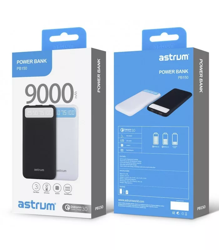 Astrum PB150 v2 gyorstöltő (QuickCharge 3.0) Power Bank 9000mAh, Li-Polymer akkucella, Dual USB 3A fehér 15W