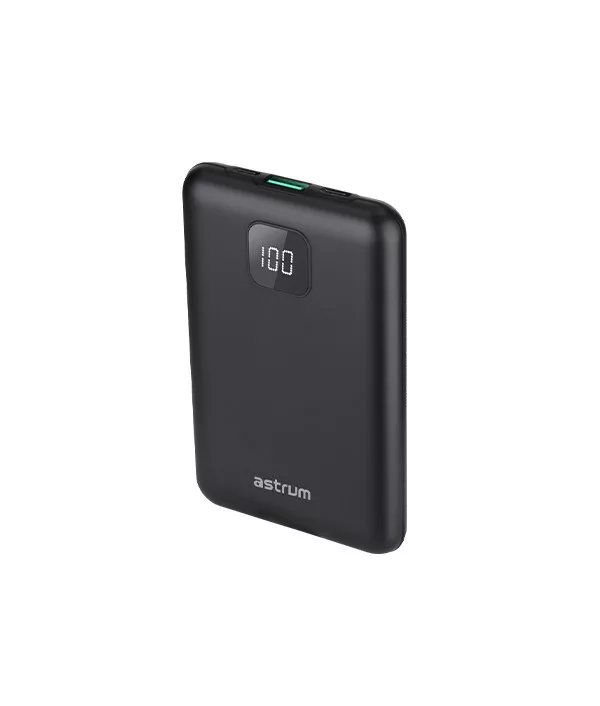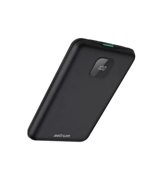 Astrum PB450 10000mAh fekete fémházas gyorstöltő PD power bank 22,5W, 1X QC 3.0 USB-A, USB-C, li-polymer cellákkal, LCD