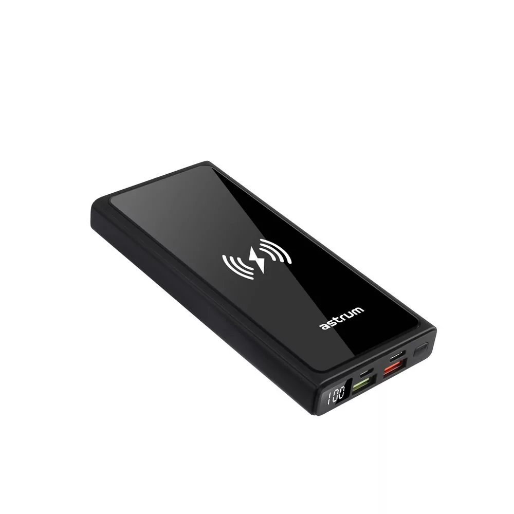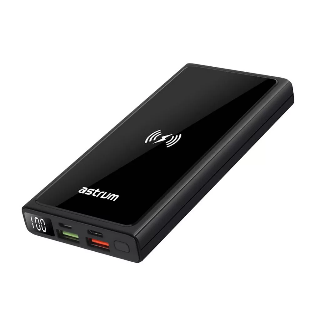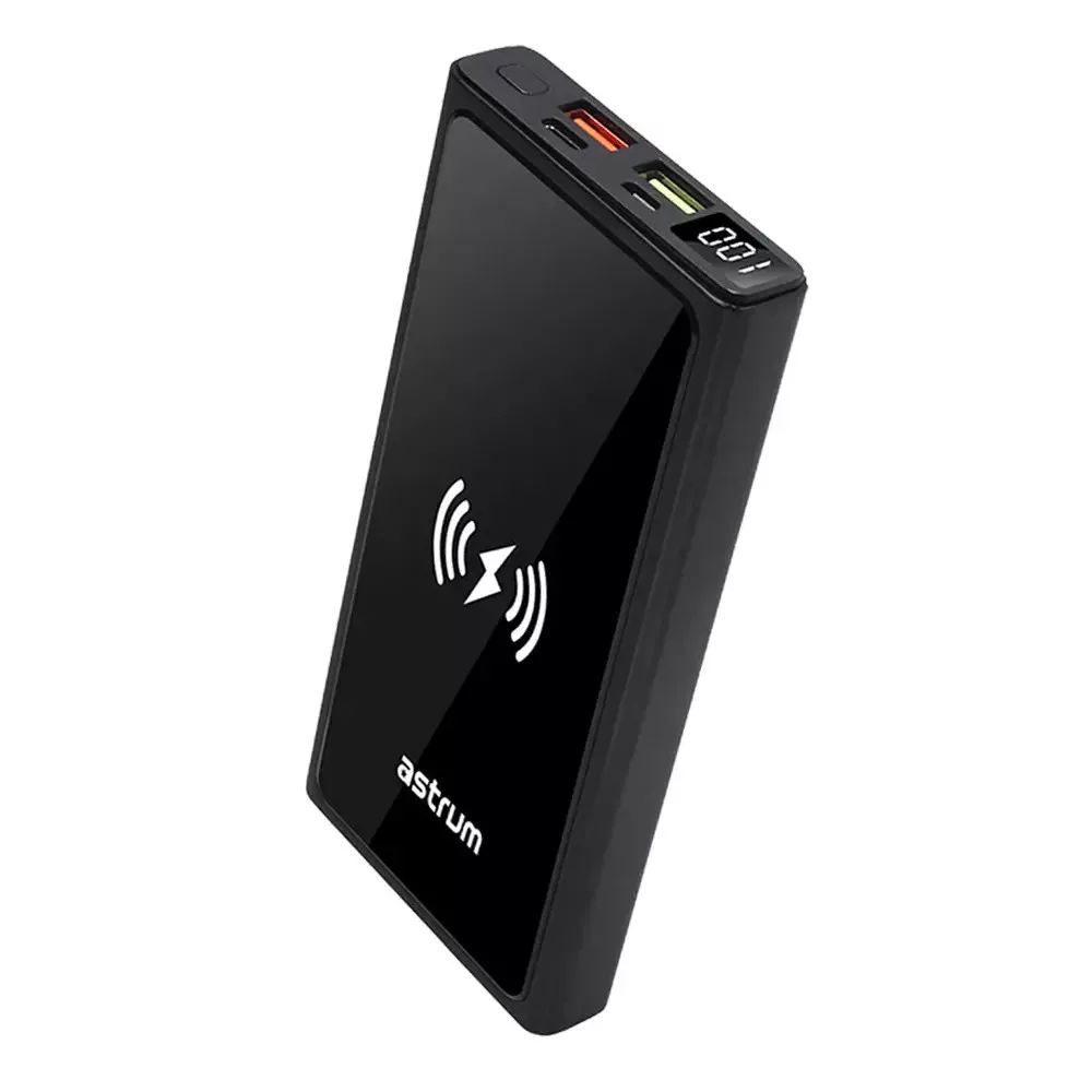 Astrum PB640 20000mAh fekete gyorstöltő PD 3.0, QC 4.0 power bank vezeték nélküli töltéssel, 2X USB-A (2.4A), 1X Type-C (22,5W), li-polymer cellákkal