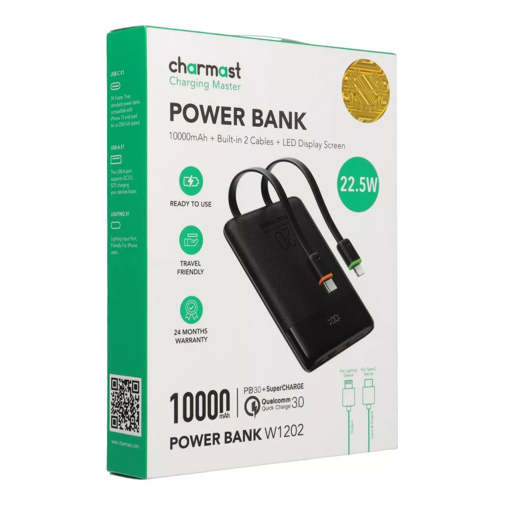 A Charmast W1202 PD3.0 3A 22.5W 10000 mAh-s külső akkumulátor beépített USB C / Lightning kábellel egy kompakt, hordozható töltő, amely 6 kimenettel, 3 bemenettel és jól látható LED kijelzővel rendelkezik , lehetővé téve akár 6 eszköz egyidejű töltését. A W1202 beépített USB -C, Lightning és Micro USB kábelekkel van felszerelve , így nem kell további kábeleket cipelned. Ez az integrált megoldás jelentősen növeli a használat kényelmét mind útközben, mind a mindennapi életben. A külső akkumulátor 6 kimenettel és 3 töltési móddal rendelkezik – a beépített USB- kábelen, Micro USB- porton vagy USB -C bemeneten keresztül . A PD 3.0 és a Smart E 3.0 töltési technológia automatikusan felismeri a csatlakoztatott eszközöket és beállítja a teljesítményparamétereket, biztosítva a gyors és biztonságos töltést akár 22,5 W teljesítménnyel. A 10 000 mAh-s kapacitás lehetővé teszi okostelefonok, táblagépek és más mobileszközök többszöri töltését. A beépített LED kijelző jelzi az akkumulátor aktuális töltöttségi szintjét, így teljes mértékben szabályozhatja az energiafogyasztást. Specifikáció:Modell: Charmast W1202Kapacitás: 10000 mAhMaximális teljesítmény: 22,5 WTöltési technológia: PD 3.0, Smart E 3.0Áramerősség: 3 AKimenetek száma: 6Bemenetek száma: 3Beépített kábelek: USB -C, Lightning, Micro USBKijelző: LEDAkkumulátor típusa: lítium-polimer