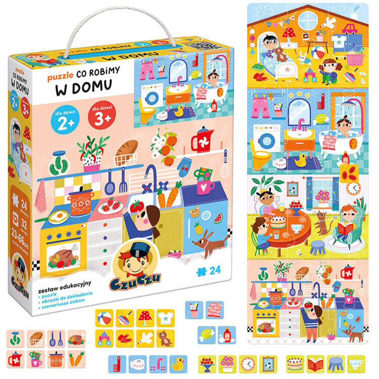 Czuczu puzzle Mit csinálunk otthon egy oktatási készlet, amely négy rejtvényből áll, amelyek a ház különböző helyiségeit ábrázolják: fürdőszoba, konyha, gyerekszoba és nappali. A gyermek feladata, hogy összeállítson egy puzzle-t szobákkal, majd párosítsa az ábrázolt tárgyakat. a csempéken a megfelelő helyiségekbe. Játszhatsz nyomozót is, és versenyt találhatsz a már elkészült rejtvényekben. Rengeteg ötlet kínálkozik a szórakozáshoz, így a Mit csináljunk otthon feladványok nem lesznek hamar unalmasak?