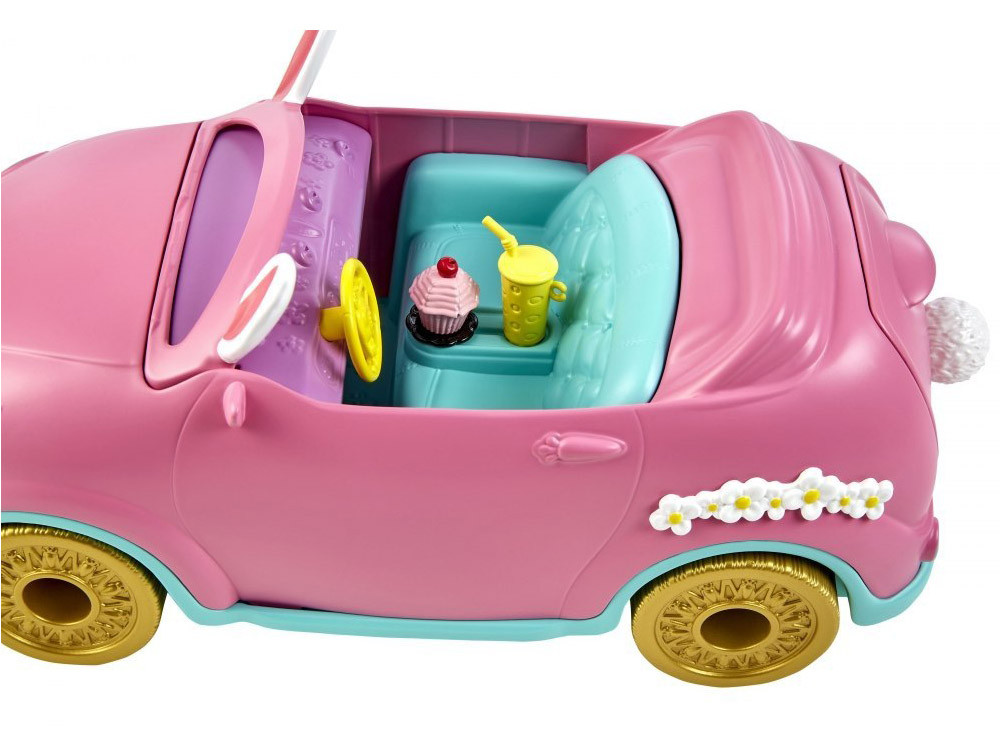 Az autó műanyagból készült, bájos, pasztell színekben. A szélvédőn nyúlfülek, a csomagtartón vicces farok találhatók, az elülső motorháztetőt pedig bajuszos orr díszíti. Ezenkívül a testet virágok díszítik. A jármű belsejében van egy kormánykerék és az ülések italok tárolására alkalmas helyekkel. Az arany kerekek rendkívül lenyűgözővé teszik az autót. A csomagtartóban szállíthatod a legfontosabb dolgokat, pl. naptej, ami egy nyitható bőröndbe rejthető.A babának hosszú rózsaszín haja és nyuszi füle van a fején. Színes felsőt (integrált) és szövet, virágos ruhát visel. Sárga cipő pomponokkal és napszemüveggel kiegészíti az ünnepi stílust. A babának mozgatható végtagjai vannak. Egy aranyos nyuszi, Twist kíséri. A figura műanyagból készült, fején játékszőr található. Vicces, mosolygós arca pimaszul néz ki!