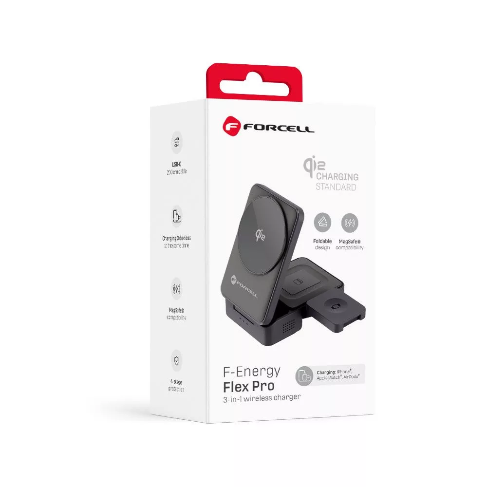 Az F-Energy Flex Pro egy praktikus töltő, amely egyszerre képes tölteni iPhone®, Apple Watch® és AirPods® készülékeket – ideális azoknak az Apple® felhasználóknak, akik kényelmet, rendszerezést és gyors hozzáférést szeretnének az áramellátáshoz. A legújabb Qi2 gyorstöltési szabványnak és az összecsukható kialakításnak köszönhetően a Flex Pro tökéletes otthonra, munkába és utazáshoz.Összecsukható töltőpanel – kényelmes telefon elhelyezés A Flex Pro összecsukható töltőpanellel rendelkezik, amely lehetővé teszi, hogy iPhone®-odat tökéletes szögben helyezd el az alkalmazások kényelmes használatához, videók nézéséhez vagy fotók böngészéséhez. Egy stabil mágneses rendszer biztonságosan a helyén tartja az okostelefonodat, megakadályozva, hogy töltés közben elcsússzon.Qi2 és erős mágnesek, amelyek kompatibilisek a MagSafe®-fel – hatékony és precíz töltés A legújabb Qi2 szabvány növeli az energiahatékonyságot és javítja az eszköz mágneses illeszkedésének stabilitását. A MagSafe® technológiának köszönhetően az okostelefon automatikusan igazodik a tekerccsel, biztosítva az iPhone® gyors, stabil és biztonságos töltését. Ez a megoldás jelentősen javítja a felhasználói kényelmet, különösen az Apple® eszközök tulajdonosai számára .3 az 1-ben – tölti telefonját, óráját és Apple® fejhallgatóját Az F-Energy Flex Pro lehetővé teszi iPhone® , Apple Watch® és AirPods® készülékek egyidejű töltését , így egyetlen kompakt eszközzel több töltőt is helyettesíthet. Letisztult kialakítása, gubancolódásmentes kábelkezelése és teljes funkcionalitása ideális megoldássá teszi az Apple® felhasználók számára .Fokozott biztonság + 200 cm hosszú kábel A Flex Pro teljes körű védelemmel van felszerelve, hogy megvédje az eszközöket a túlmelegedéstől, túlterheléstől, túlfeszültségtől és idegen tárgyak kisülésétől ( FOD ). A készlet tartalmaz egy hosszú , 200 cm-es USB -C® kábelt is , amely lehetővé teszi, hogy a töltőt bárhová elhelyezd – függetlenül attól, hogy van-e rajta konnektor.Műszaki adatok: Bemenet: 9V 3A (25W max)Kimenet (telefon): 5W / 7.5W / 10W / 15W (Max)Kimenet (fejhallgató): 3W (Max)Kimenet (óra): 2.5WÖsszteljesítmény: 20.5W (Max)Kábel: USB -C®, 200cm
