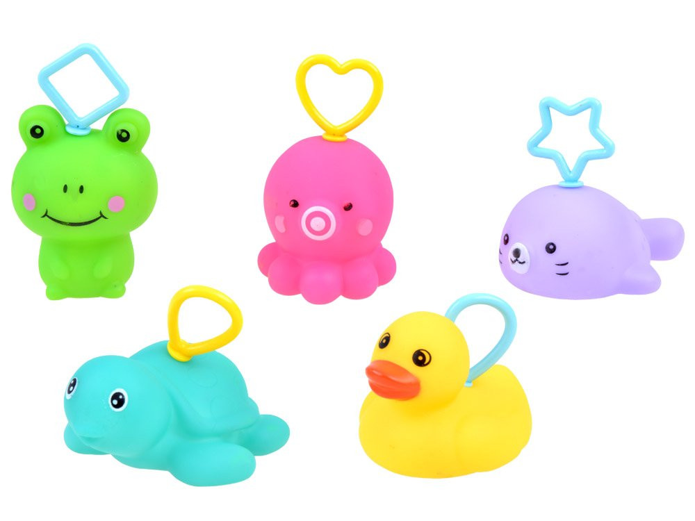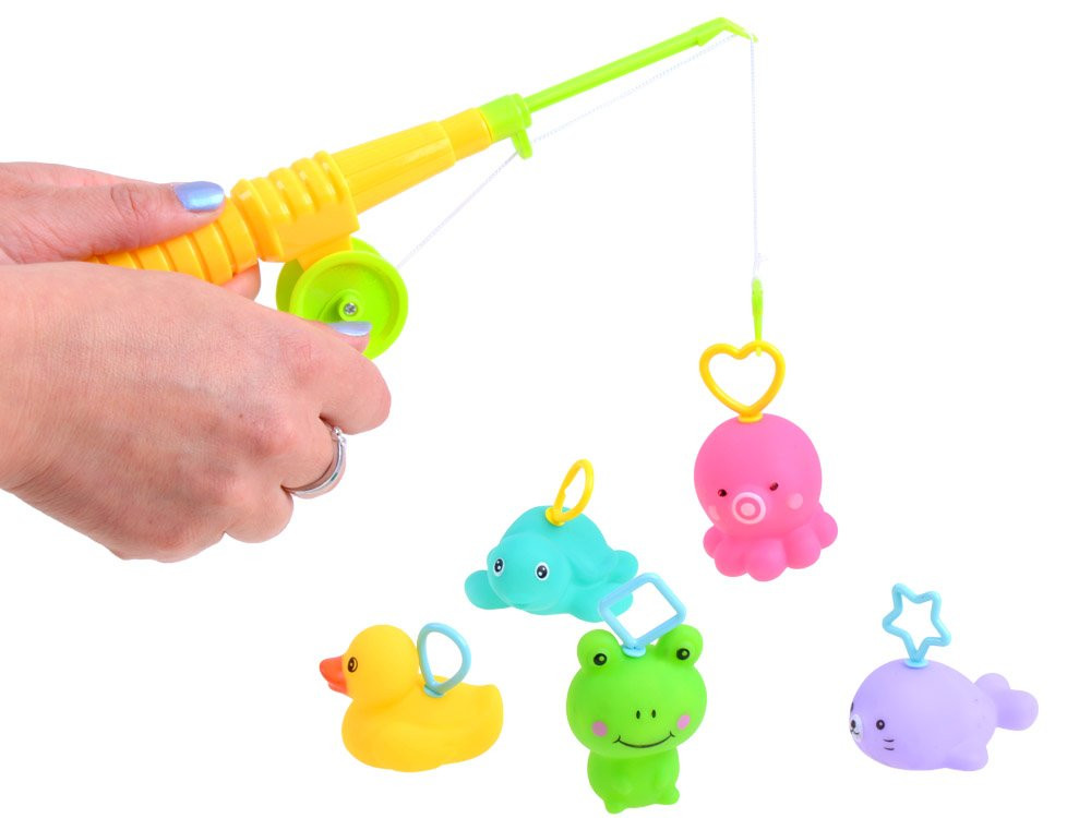Egy 5 db-os gumiállat + egy vízben játszható horgászbotból álló készlet több fürdés során is megtalálja majd a használatát. A gyerekek szeretnek a vízben csobbanni, és ha van még valaki, akivel, akkor csak ne kelljen kiszállni a vízből. A gumiállatkészlet fürdés közbeni csobbanásra alkalmas, a játékokhoz műanyag kampók vannak a megfogáshoz. játék közben, és mindegyik állat rendelkezik egy integrált csővel.