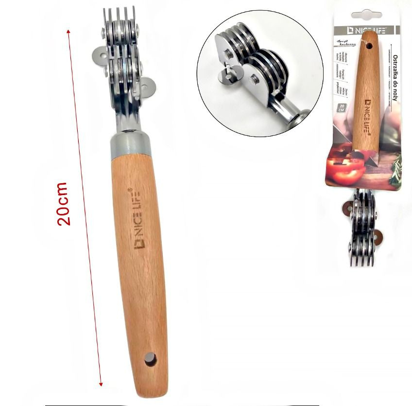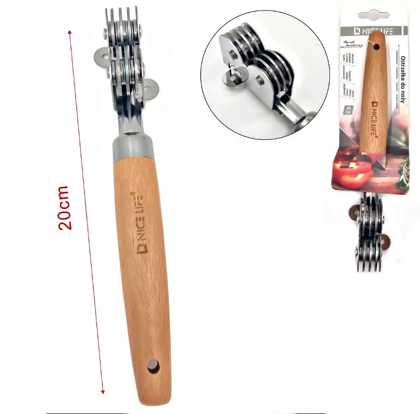 A praktikus univerzális késélező rozsdamentes acélból készült, fa fogantyúval. Nagyon hasznos minden konyhában. Ennek köszönhetően minden kést sima pengével élezünk. Helyezzük az élezőt egy sima felületre, és tartsuk erősen.