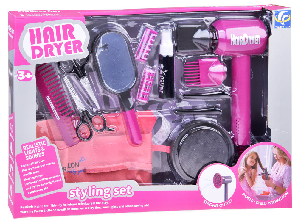 Szett egy kis fodrásznak - ez egy kiegészítő készlet minden olyan kislánynak, aki fodrász lenni, szeret játszani a hajjal, és saját mini fodrászszalont szeretne nyitni a szobájában. A színes készlet valósághű szórakozást tesz lehetővé, tele izgalommal és mosollyal. A jó szórakozás anyuval, nagynénivel vagy barátokkal garantált.