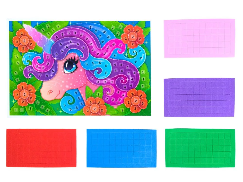 Kreatív készlet a művészetet kedvelő gyerekeknek. Színes képből álló készlet, amit természetesen a színek és formák igazításával habos négyzetekkel kell beborítani.