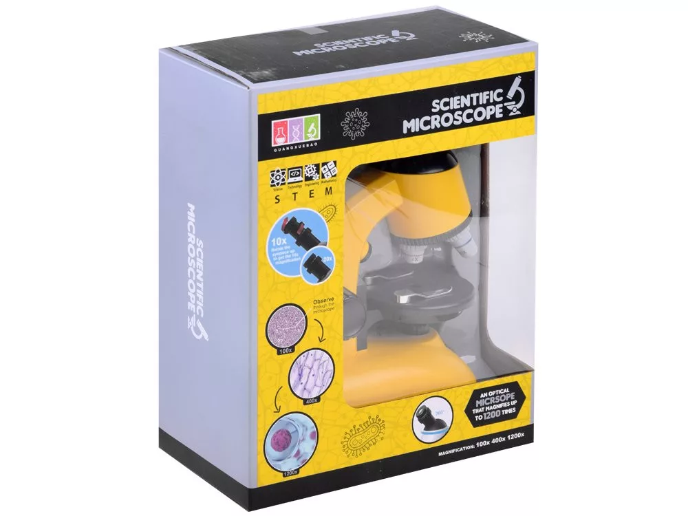 Egy kis laboratóriumi mikroszkóp nagyszerű ajándék lesz azoknak a kis tudósoknak, akik szeretnek szabad szemmel nem látható dolgokat megfigyelni. A mikroszkópnak köszönhetően gyermekünk a megszokottnál közelebbről ismeri meg a minket körülvevő világot. A mikroszkóp egy kis felfedezőt vezet be a mikrobiológia, a tudomány és a természet csodálatos világába. A mikroszkóp 360°-ban elforgatható okulárral, háromféle 4x / 10x / 40x nagyítással és beépített izzóval rendelkezik a vizsgált minták megvilágítására. A készlet nagyon gondosan és pontosan készült, teljes egészében műanyagból, 2 db AA elemmel működik (nem tartozék). A mikroszkópban minden megtalálható, ami a mikrovilág megtekintéséhez szükséges.