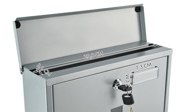 - FEDETT LEVÉL BEFOGADÁSA / A4-ES FORMÁTUM – a postaláda egy bedobónyílással rendelkezik, amelyet speciális borítás rögzít, hogy megvédje a levelezést az időjárás viszontagságaitól. Még az A4-es méretű levelek is elférnek a postaládában.