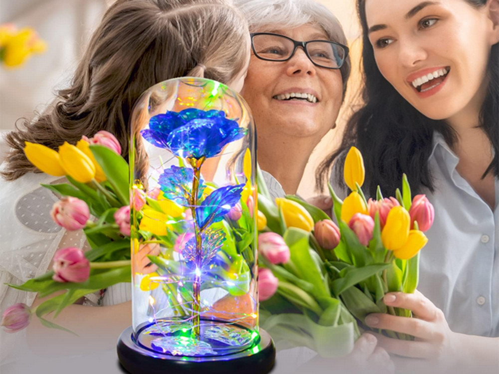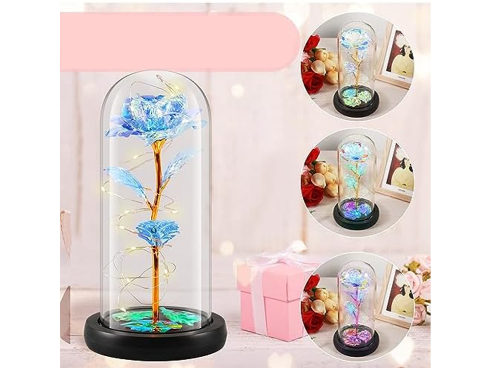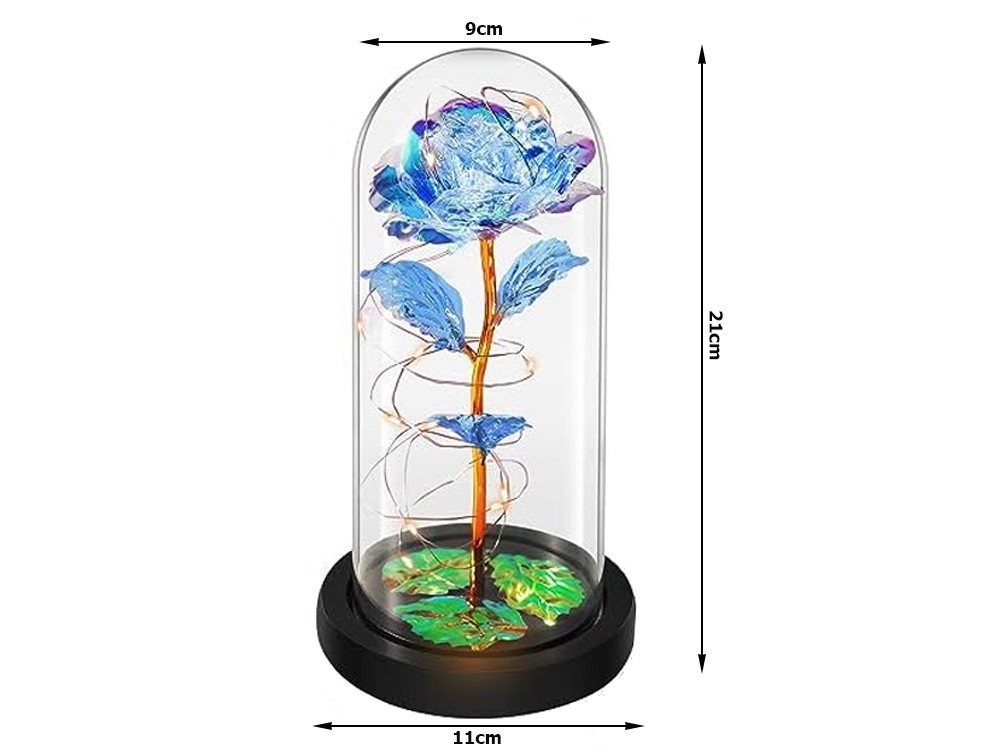 ÖRÖK RÓZSA ÜVEGBEN AJÁNDÉK LED VILÁGÍTÓ KÉK ÜVEG NŐNAPRA Az Örök rózsa üvegben megvilágítással egy nem mindennapi ajándék, amely nemcsak varázsával gyönyörködteti a szemet, de a szíveket is megolvasztja. Tökéletes ajándék évfordulóra, születésnapra, Valentin napra, eljegyzésre vagy egyedi dekorációnak. A rózsa üvegedényben van elhelyezve, amely kiemeli szépségét, megóvja a portól és a sérülésektől. Az üvegdoboz átlátszó, így a virágot minden oldalról megcsodálhatjuk. A fényt visszaverő, finom szirmok színét a fénytől függően változtatják. környezet, amelyben a rózsa áll. Ha a háttér rózsaszín és piros árnyalatú, a szirmok színe rózsaszínűbbé válik. Viszont ha a háttérben pl. kék, a dekoráció kékebbé válik, és így tovább. A termék különlegessége a finom LED-es háttérvilágítás, amely a rózsát éjszaka életre kelt, és varázslatos varázst kölcsönöz neki. A háttérvilágítás meleg fehér színű. Eredeti ajándék, amelyre sokáig emlékezni fogunk. A rózsa elbűvölő, és minden nőnek tetszeni fog. MŰSZAKI ADATOK:✅ Termékkód: 26108✅ Anyaga: műanyag , üveg✅ Műrózsa✅ LED világítás meleg fehér színben✅ Tápellátás: 3 x AAA (nem tartozék)✅ Fekete műanyag talp✅ Ideális ajándéknak✅ Szín: arany árnyalatok ✅ Elegáns rózsaszín doboz zsinórokkal a rögzítéshez✅ S tirofoam védelem az üvegernyőhöz MÉRETEK:✅ Lámpabúra magassága talppal: 21cm✅ Talp átmérője: 11cm✅ Diffúzor átmérője: 9cm SZETT TARTALMAZ:☑️Rózsa üvegben új, örökké tartó fényszóró ☑️ Eredeti, elegáns doboz
