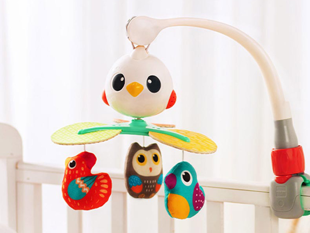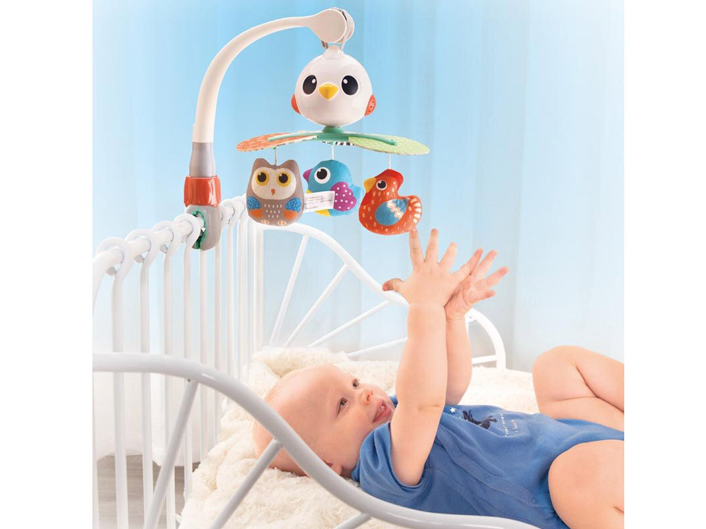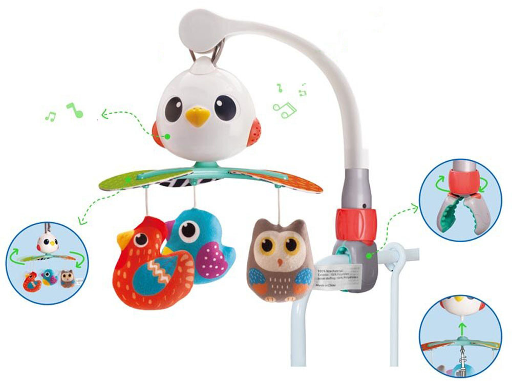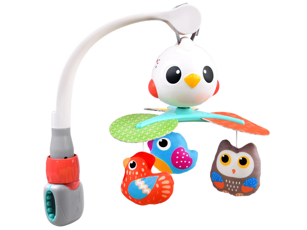 Specifikáció:- Háromlépéses kapcsoló nyugodt, finom hangokkal és dallamokkal- és a 360 fokos hangok elforgatásának lehetősége- 3 plüss, színes madarak- A főpanel egy madár feje is- a mobilnak van egy univerzális klipje és egy fejpántja van a kiságy