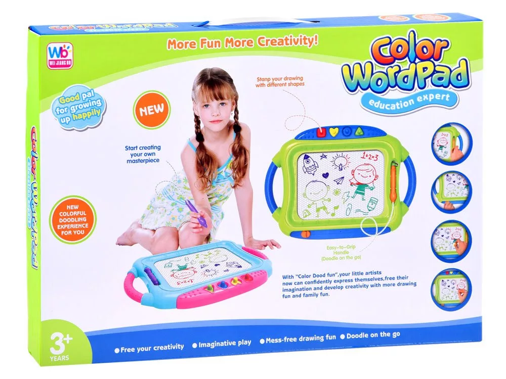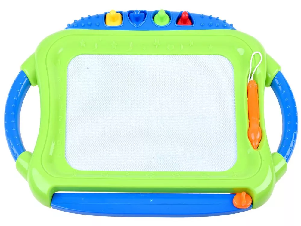 A firkálókkal ellátott táblára minden olyan gyermek számára javaslat, aki szeret rajzolni, festeni, írni. A négyszínű repülőgép lehetővé teszi többszínű rajzok készítését. A táblán nagy méretű, annak köszönhetően, hogy a gyermeknek sok mindent meg kell mutatnia. A tábla háttere többszínű, amikor rajzol, az a írás vagy a festés függvényében változik. A bélyegeket festéshez is használják. Ha gyermeke unatkozik a rajzmal, vagy nem tetszik, akkor egyszerűen törölheti azt egy csúszó jelölővel. A leírás nélküli játék nagyszerű megoldás lesz az unalmas estékre. Festhet, írhat egy ceruzával vagy bélyegmintával a táblára. A geometriai figurák alakjában lévő bélyegek vonzóbbá teszik a rajzokat. A kreativitás és a találékonyság lehetővé teszi a különféle formák és karakterek létrehozását.
