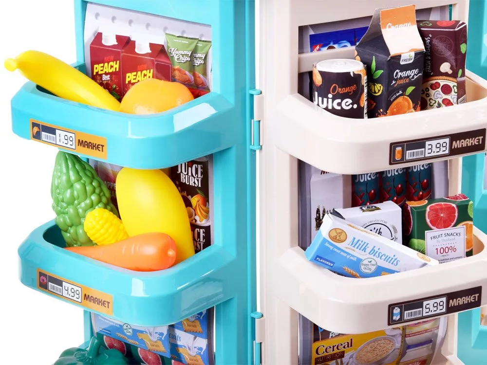 A készlet tartalmazza:- Egy számláló polcokkal és zászlókkal- raktár súlya- vonalkód-olvasó / szkenner- Terminál + hitelkártya- Vásárló kocsi- Papír pénz- Dime-karton csomagolás élelmiszertermékek (például sütemények, édességek, pizza, gyümölcslé) - Az élelmiszeripari termékek műanyag csomagolása (például kávé bögrék, cukorzsákok, kannák gyümölcslé, joghurtok, tej)- gyümölcs (banán, narancs, mangó, alma)- zöldségek (sárgarépa, articsóka, kukorica, paprika)- Croissant- Baguette- tojás