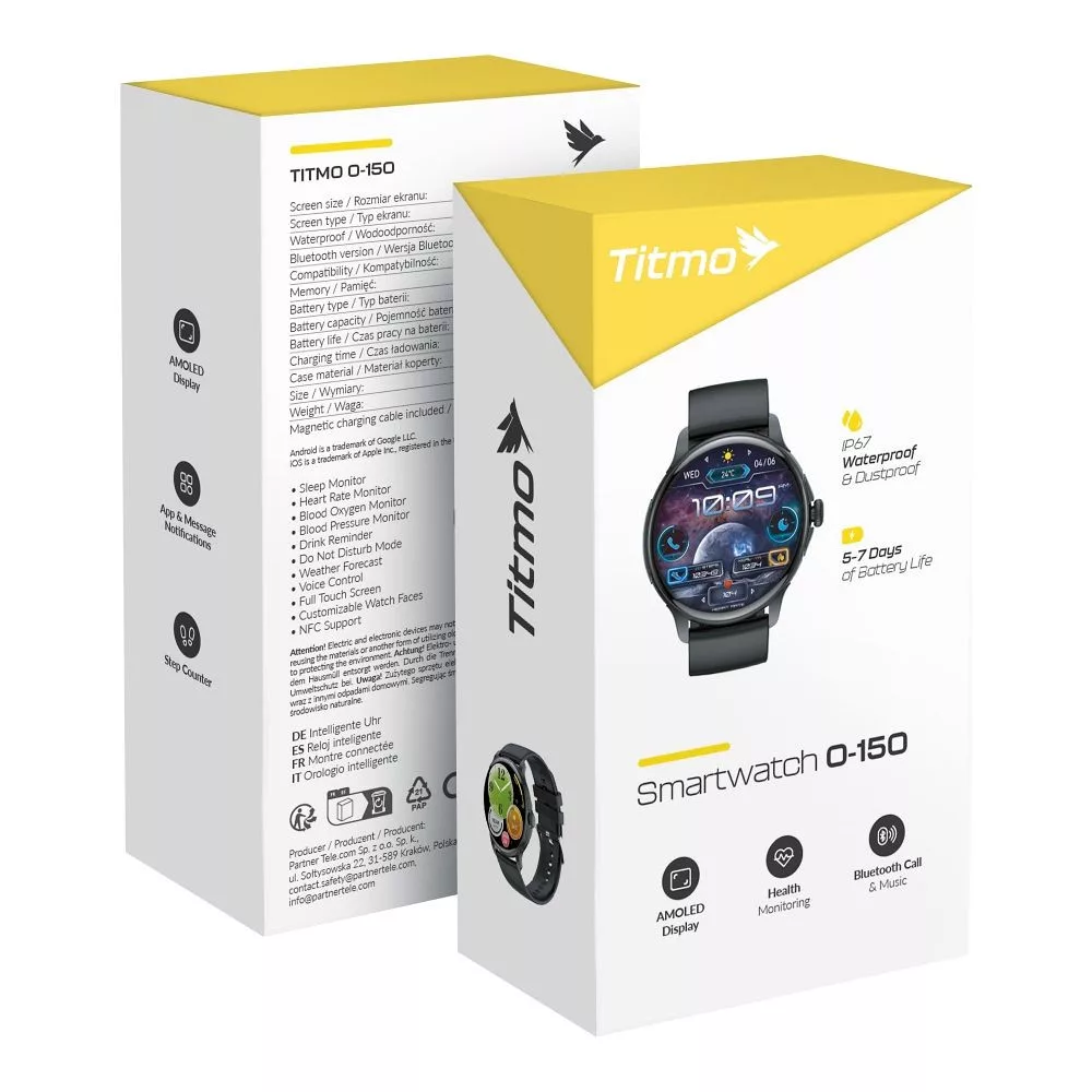 A Titmo O-150 lehetővé teszi a pulzusszám, a vér oxigénszintjének, a vérnyomásnak és az alvásnak a monitorozását, többek között. További funkciók, mint a hidratálási emlékeztető, a lépésszámláló, az alvásfigyelő és a Ne zavarj mód támogatják az egészséges életmódot.Bluetooth, értesítések és NFC.