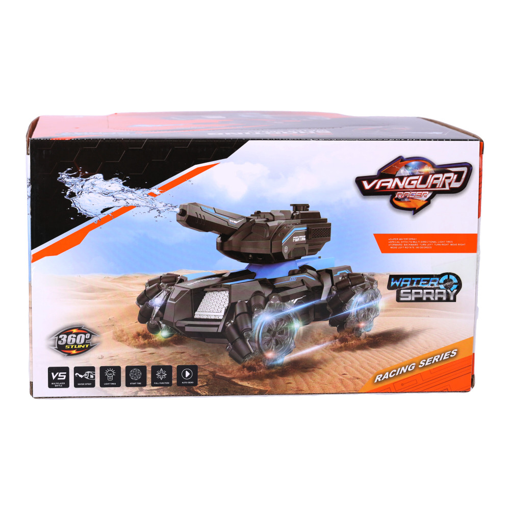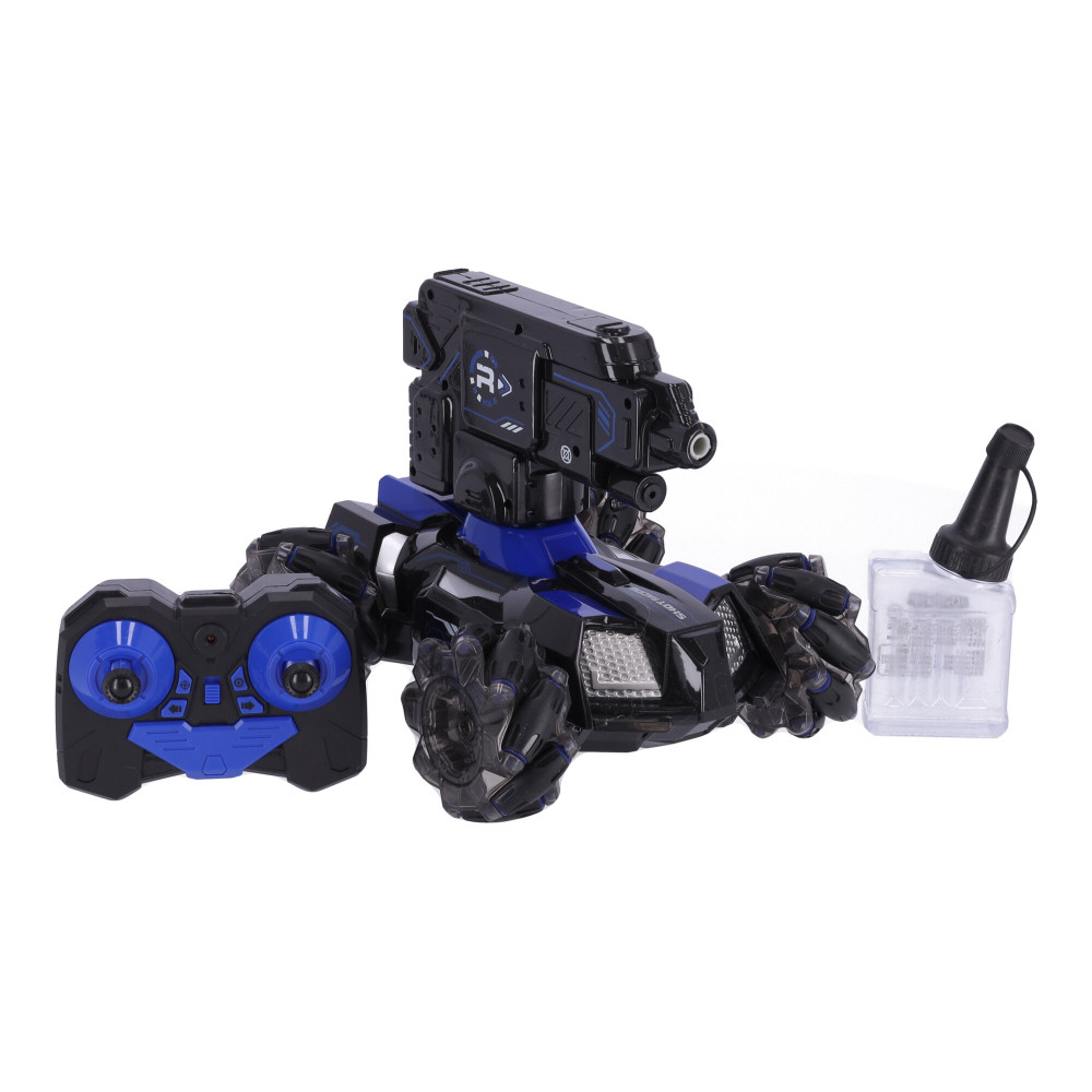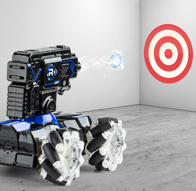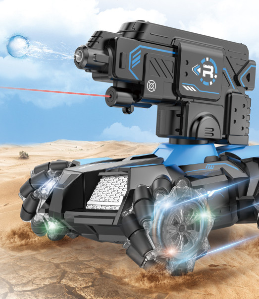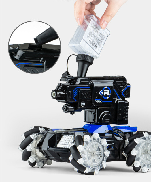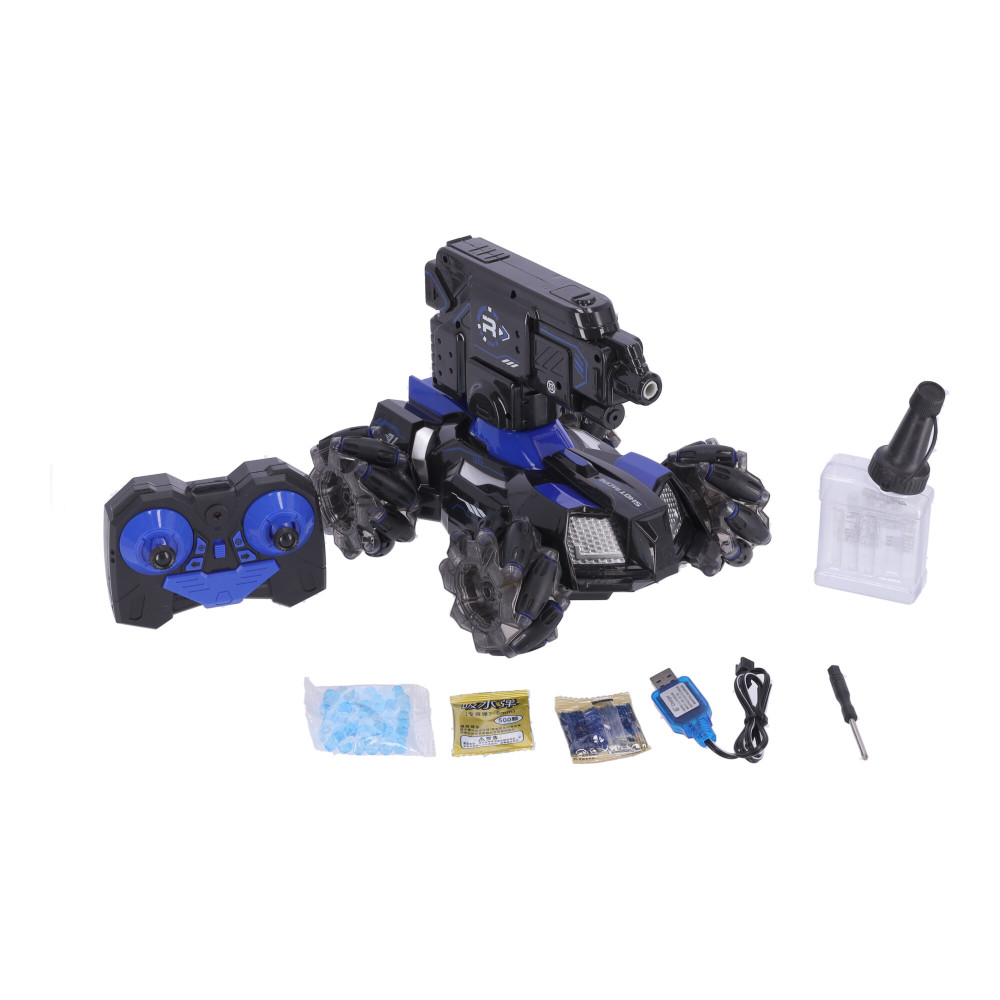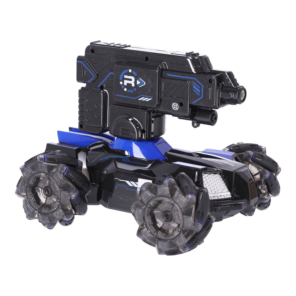 Ez egy olyan gép, amelyet különféle terepen történő mozgásra terveztek. Az autó kialakítása négykerék-meghajtású, független felfüggesztésű tengelyekkel rendelkezik, nagy hasmagassággal. Az autó kerekei nagy távolságra vannak elhelyezve, ami garantálja a maximális stabilitást. Az autó erős motorral van felszerelve. Az autó többszínű kerekek megvilágításával van felszerelve. A gép vízgolyókat lő, a lövedékek biztonságosak, nem károsítják az embereket vagy az állatokat. A távirányítós autó három lövési frekvenciával rendelkezik, amelyek távirányítóval állíthatók. Az autó görgős kerekekkel van felszerelve, amely lehetővé teszi, hogy bármilyen irányba mozogjon. A szerkezet egy kerék, amelyre több görgő van felszerelve. A kerekek forgási irányának és sebességének megváltoztatásával az autót bármilyen irányba mozgathatja - nem csak előre és hátra, hanem balra és jobbra is. Ez a távirányítós autó infravörös célzással rendelkezik.Tulajdonságok: anyaga: ABS4,8V 700 mAh nikkel-kadmium újratölthető akkumulátor töltési idő: 120 perctávirányító távolság: kb 50-70 m2,4 GHz távirányítóTávirányító elem 2 db AAA Termék mérete 36x20x30