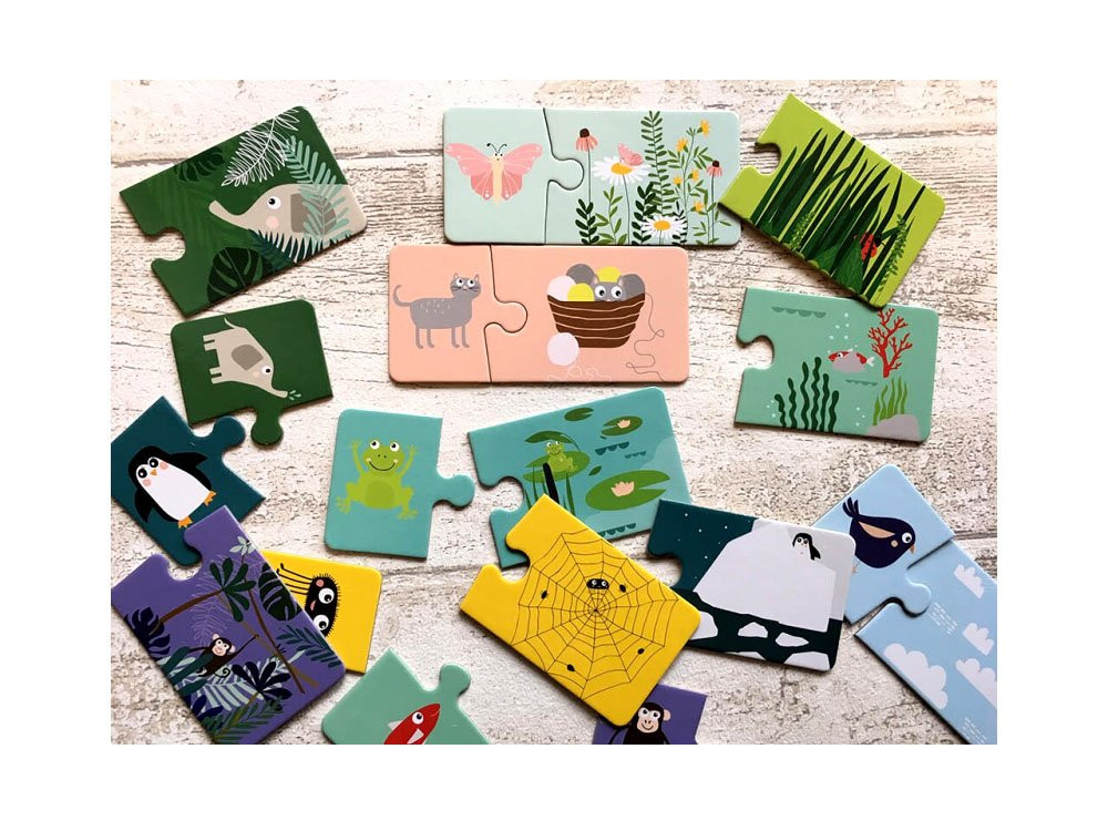 A színes feladványok felkeltik a kisgyermek érdeklődését, a gyönyörű illusztrációk pedig az állatok keresésének, felismerésének és elnevezésének hosszú mókáját. A rejtvényekkel való játék pozitívan befolyásolja a gyermek beszédfejlődését. A kiváló minőségű kidolgozás és a tartós anyagok garantálják a hosszan tartó szórakozást.