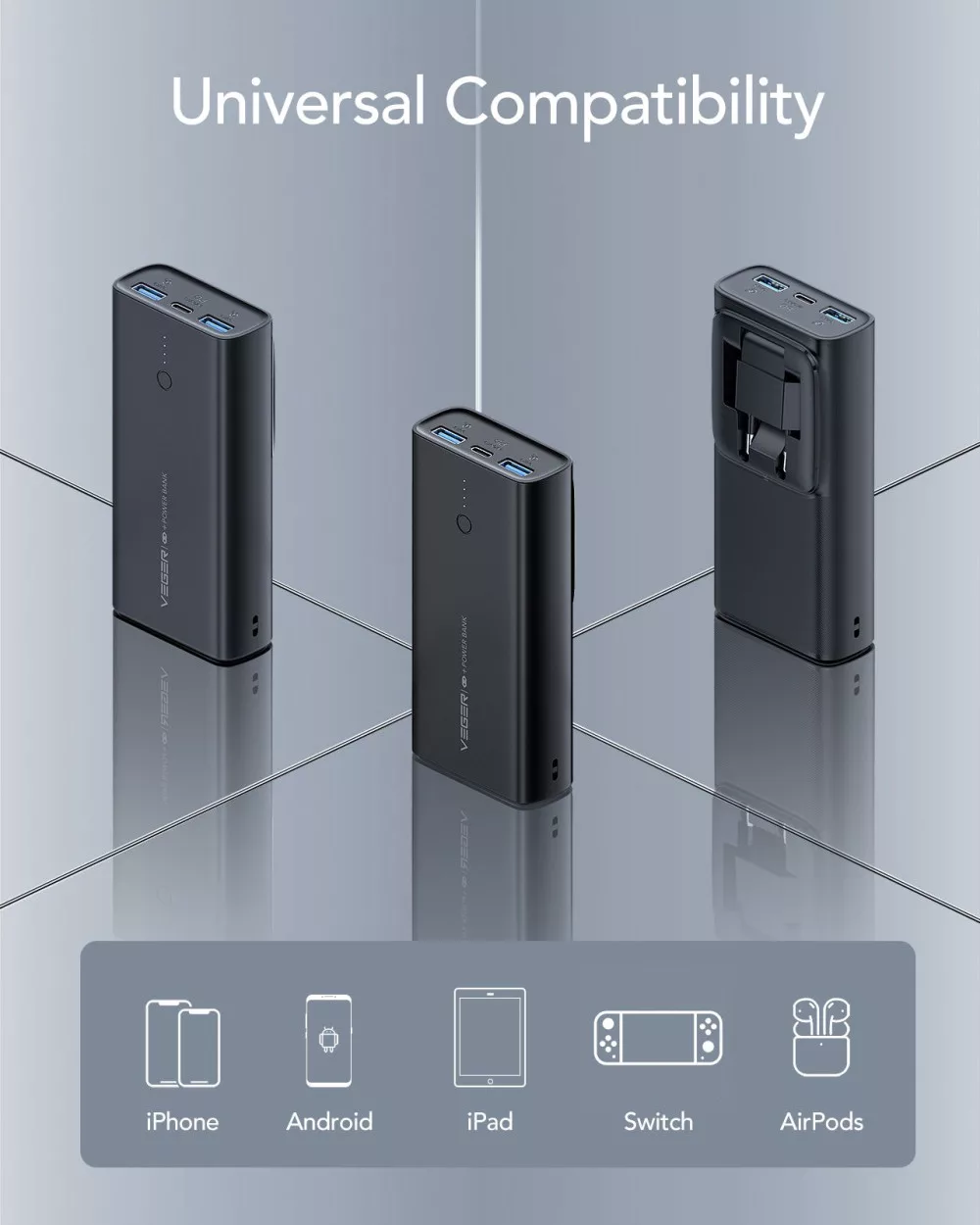 - Sok Eszköz Egyszerre: A VEGER ACE100 három különböző porttal rendelkezik, beleértve az USB-C-t és két USB-t, amelyek támogatják a Power Delivery (20W) és a Quick Charge 3.0 technológiát. Ez lehetővé teszi, hogy egyszerre három eszközt töltsön, beleértve okostelefonokat, táblagépeket, kézikonzolokat és TWS fejhallgatókat is. Az USB-C csatlakozóval könnyedén csatlakoztathatja a legújabb eszközöket.