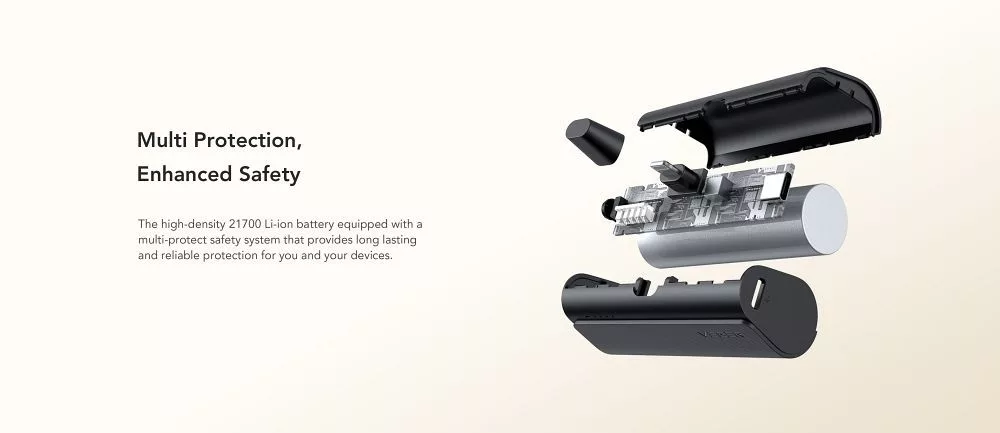 A power bank beépített USB-C csatlakozóval rendelkezik, Közvetlenül a készülékhez csatlakozik, így nem kell további kábelt magával vinnie.