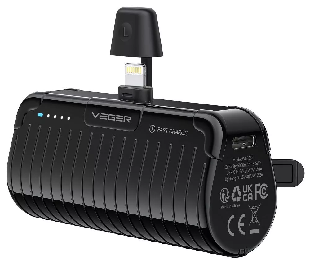 A kompakt Veger PlugOn W0558P Power bank beépített Lightning csatlakozóval, 5000 mAh kapacitással garantálja a gyors töltést bárhol és bármikor.