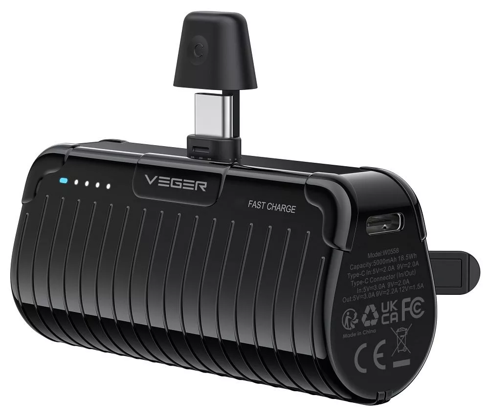 A kompakt Veger PlugOn W0558 Power bank beépített USB-C csatlakozóval, 5000 mAh kapacitással garantálja a gyors töltést bárhol és bármikor.