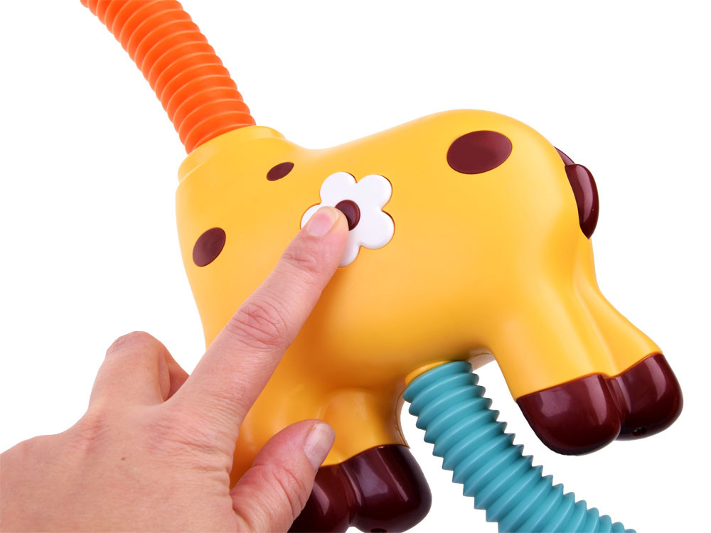 A zsiráf hasán található virág alakú gomb bekapcsolása után a pumpa vizet szív, ami a lyukakból folyni kezd.