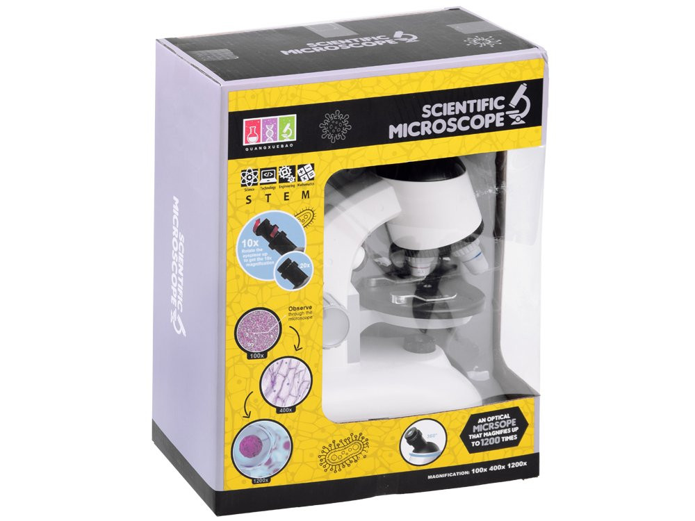 Egy kis laboratóriumi mikroszkóp nagyszerű ajándék lesz azoknak a kis tudósoknak, akik szeretnek szabad szemmel nem látható dolgokat megfigyelni. A mikroszkópnak köszönhetően gyermekünk a megszokottnál közelebbről ismeri meg a minket körülvevő világot. A mikroszkóp egy kis felfedezőt vezet be a mikrobiológia, a tudomány és a természet csodálatos világába. A mikroszkóp 360°-ban elforgatható okulárral, háromféle 4x / 10x / 40x nagyítással és beépített izzóval rendelkezik a vizsgált minták megvilágítására. A készlet nagyon gondosan és pontosan készült, teljes egészében műanyagból, 2 db AA elemmel működik (nem tartozék). A mikroszkópban minden megtalálható, ami a mikrovilág megtekintéséhez szükséges.